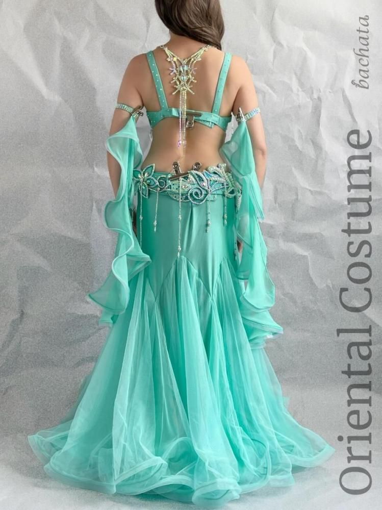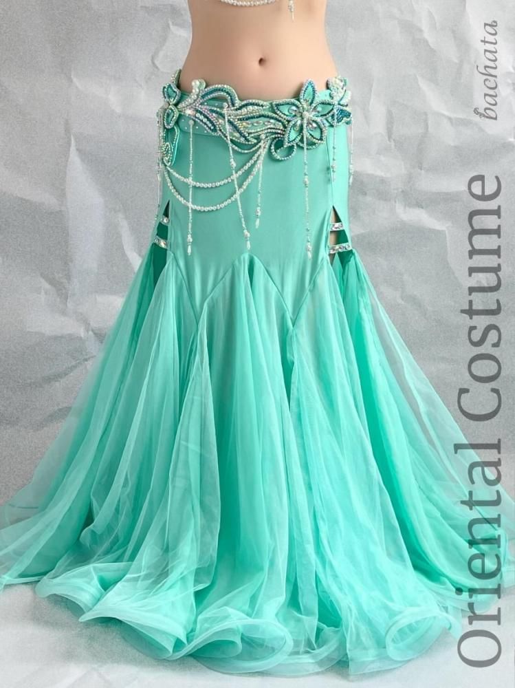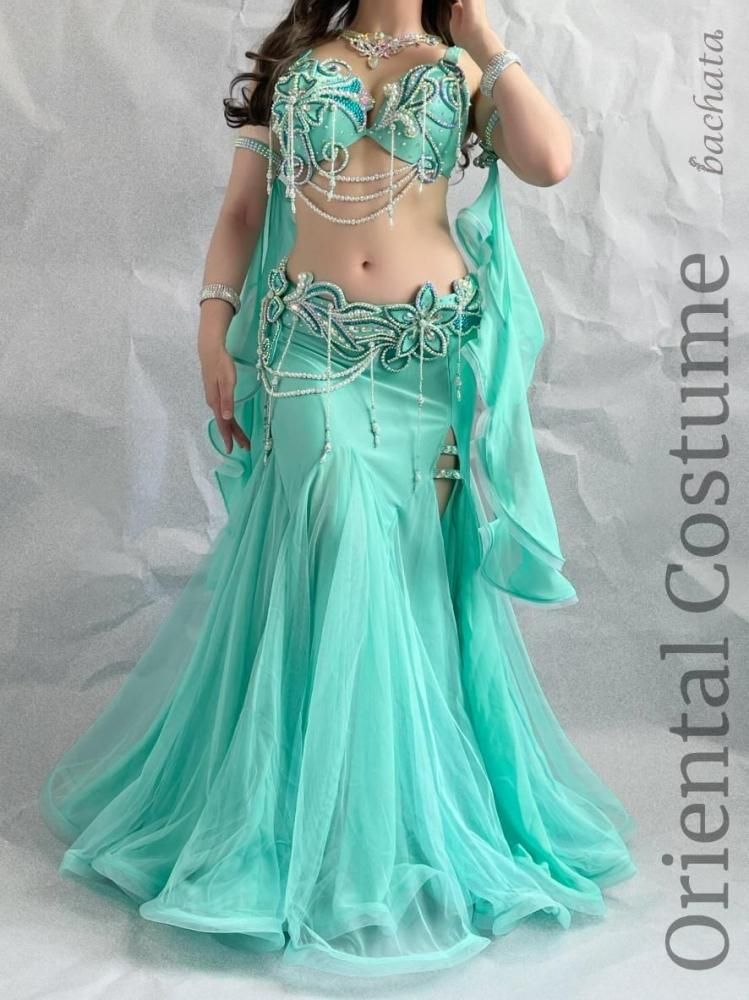 ミントグリーンの爽やかな色味に、プルメリアを思わせる大きなフラワーモチーフが、まるで夏の海風が吹いたような気分にさせてくれる、ブラベルトタイプの衣装です♡