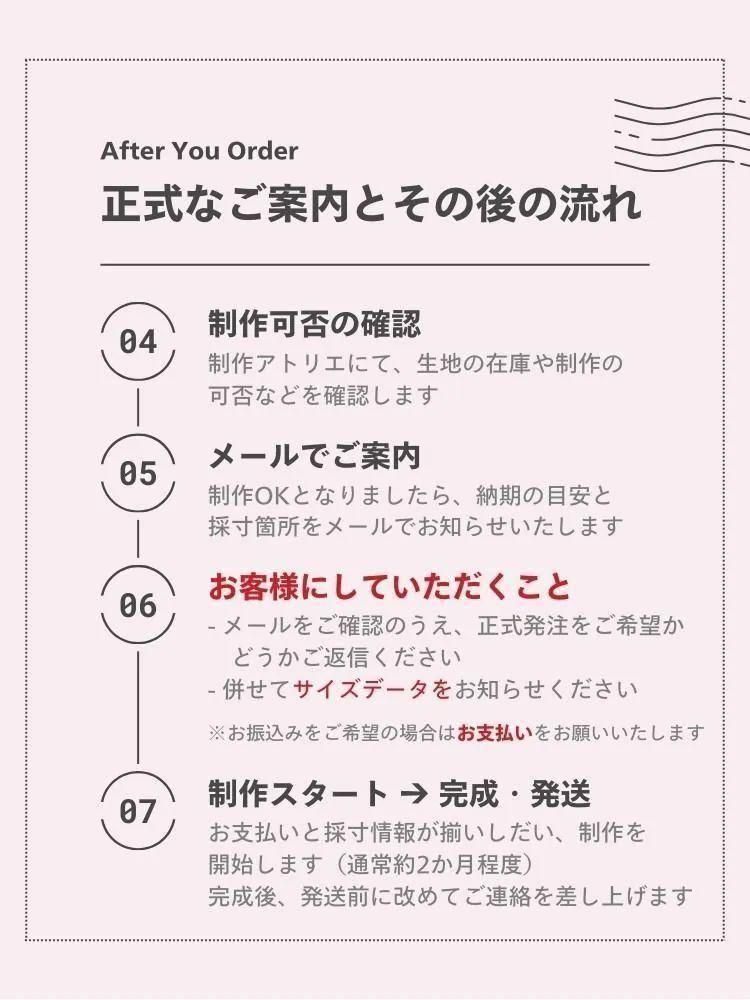 お支払い完了後、サイズをご連絡いただいた時点で正式に発注となります。
