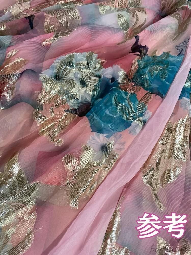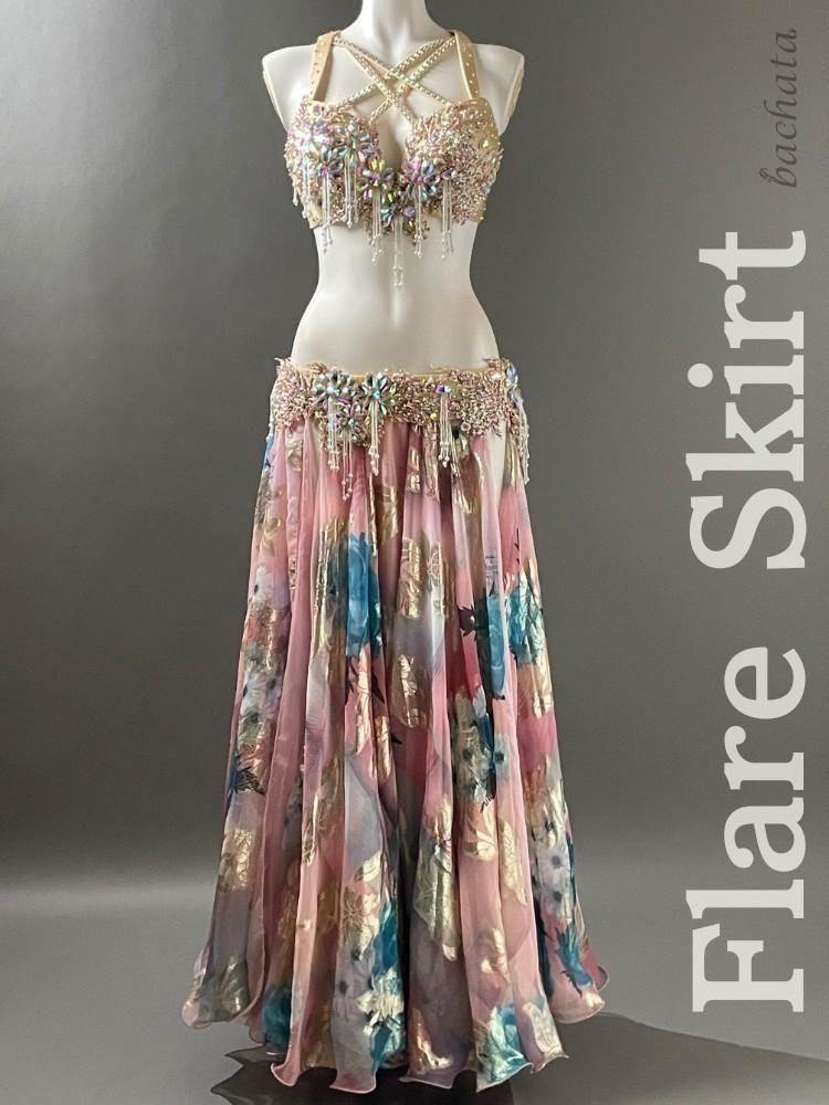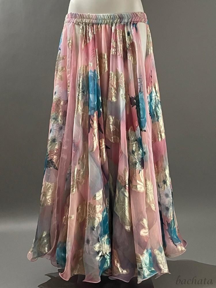 淡いピンクをベースに、ブルーやホワイトの花模様と光沢が煌めく、圧倒的な存在感のフレアースカート。