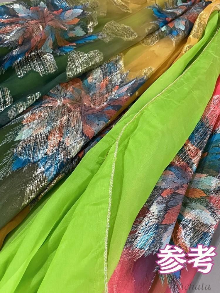 前面はイエローやグリーン、ブルーが織り交ざった爽やかな配色、後ろ側は温かみのあるオレンジ系の色味が広がり、ステージ上で華やかな表情の変化を演出します。