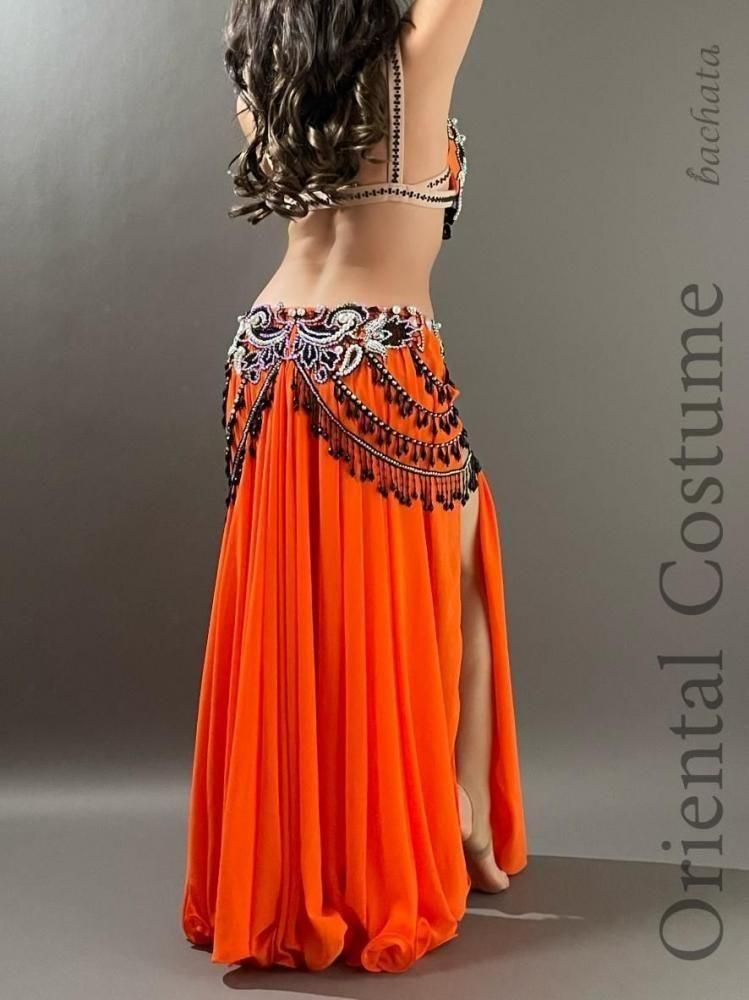 鮮やかなネオンオレンジに、ブラックの装飾が映えるインパクト抜群の一着。