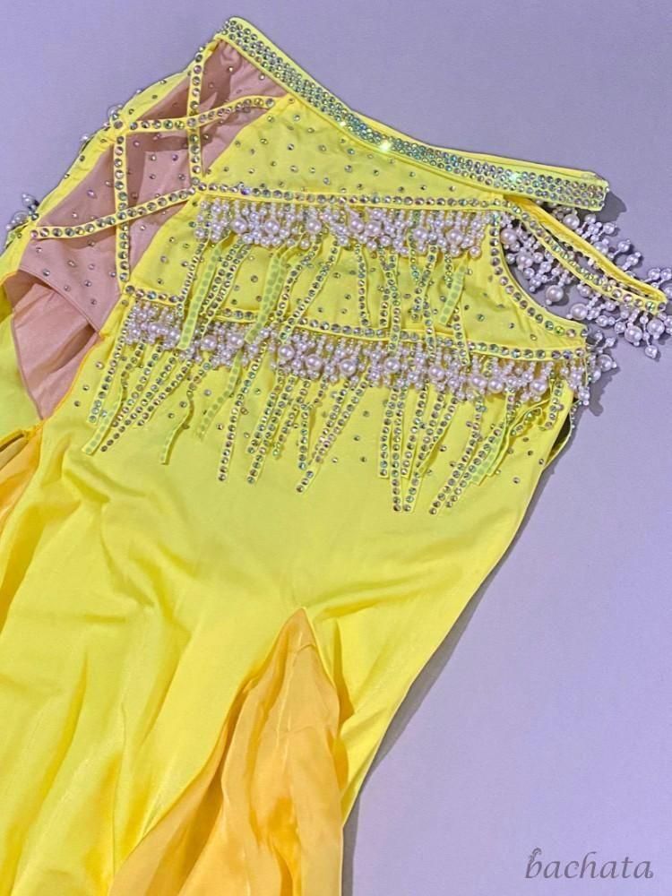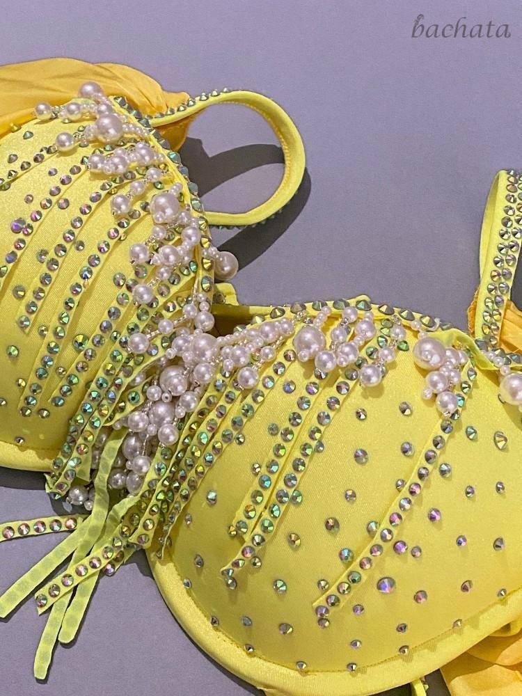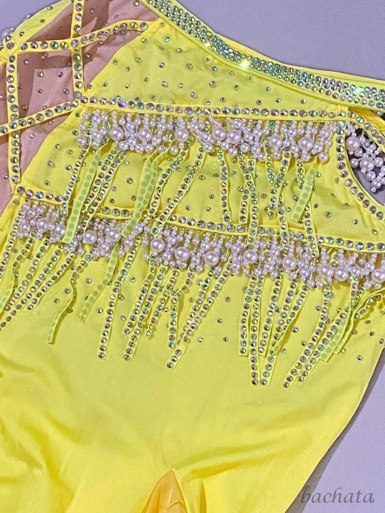 レモンイエローとブルーのパキッとカラーに、パールが上品さを添えた大人可愛い一着。