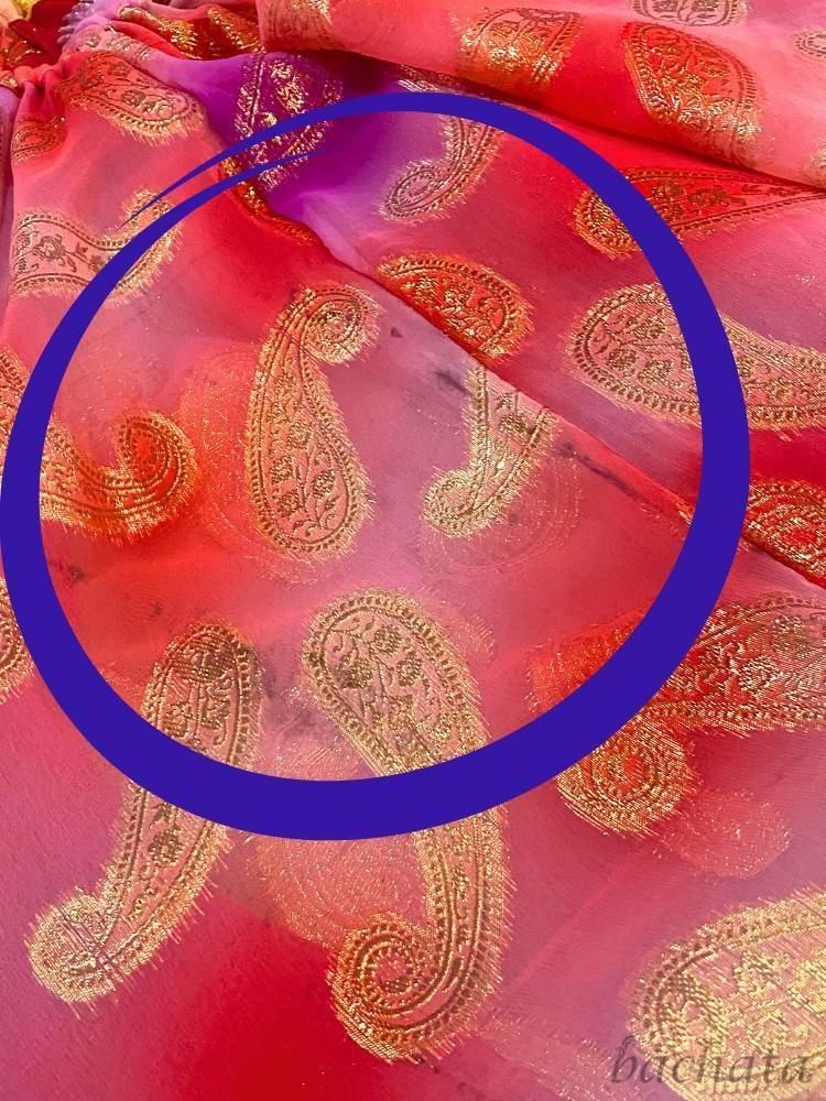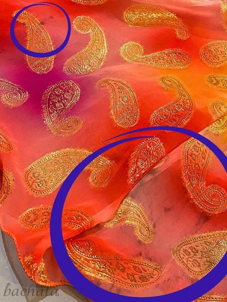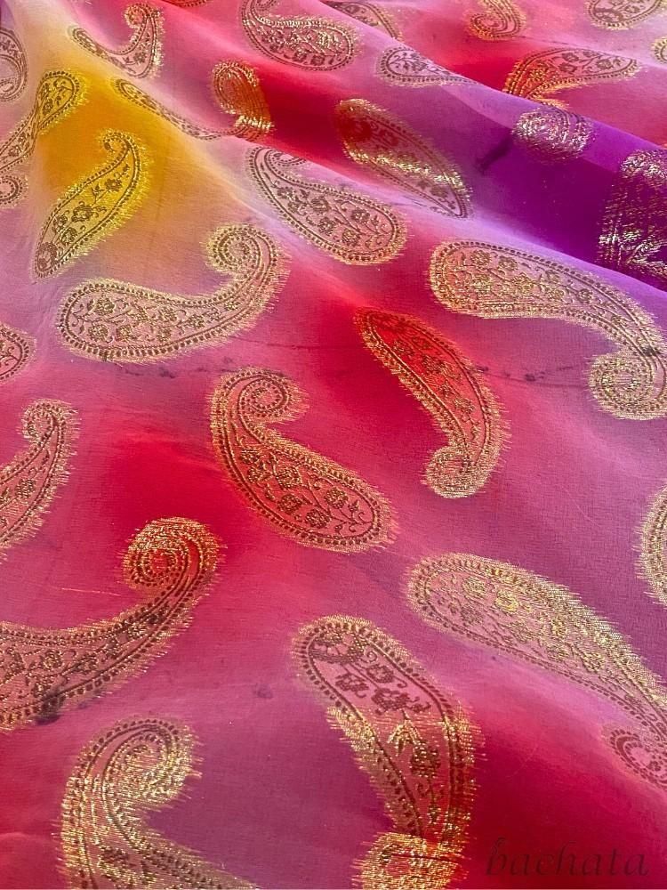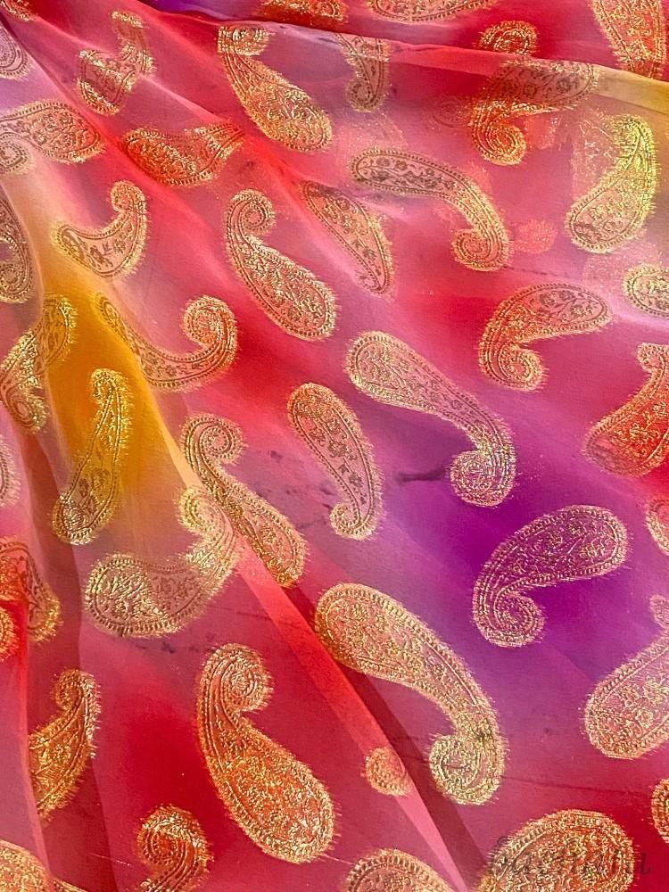 ピンクからオレンジ、パープルまでの柔らかなグラデーションに、ゴールドのペイズリー柄が映えて、とても華やかな印象。